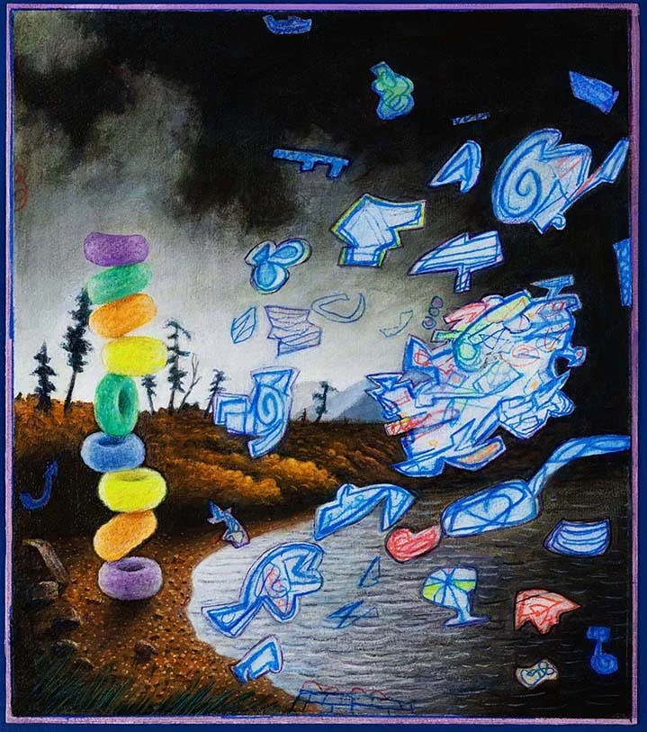 These recent works, entitled “The Dollar Tree” are made on heavy (400 lb) paper,/board, drawn / painted with acrylic and marker. There are scattered cartoony 2 dimensional images floating/flying over entirely disparate landscapes. There is a clear disjunction between the superimposed floating images and the partially-in-shadow, landscape spaces behind, which is what makes these images so engaging. They initially resemble collages or appliquéd superimpositions, but they are not. The semiabstract flat cartoon images are painted first, and then the surrounding deep landscape is filled in. The superimposed cartoons are bright and colorful like things one might see in a Dollar store, knitted into backgrounds which are meticulous nineteenth century landscapes in the Hudson River style. The effect—seeing something floating over a landscape—is hallucinatory, or something like deep reverie. And like hallucination, one is drawn in, bothered in a wonderful way by the question—what is it that I am seeing?